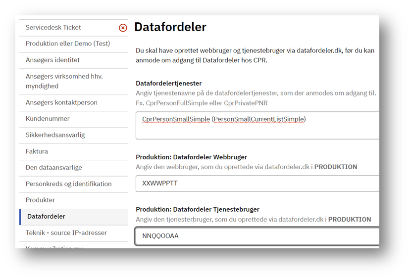 Når godkendelsen fra CPR er modtaget, skal datafordeler.dk support kontaktes direkte, og der skal anmodes om adgang for Webbruger og Tjenestebruger til Produktionsmiljøet (https://selfservice.datafordeler.dk) under henvisning til godkendelsen fra CPR.dk, samt foretages IP whitelisting af DPG-servicens faste, eksterne IP-adresse.