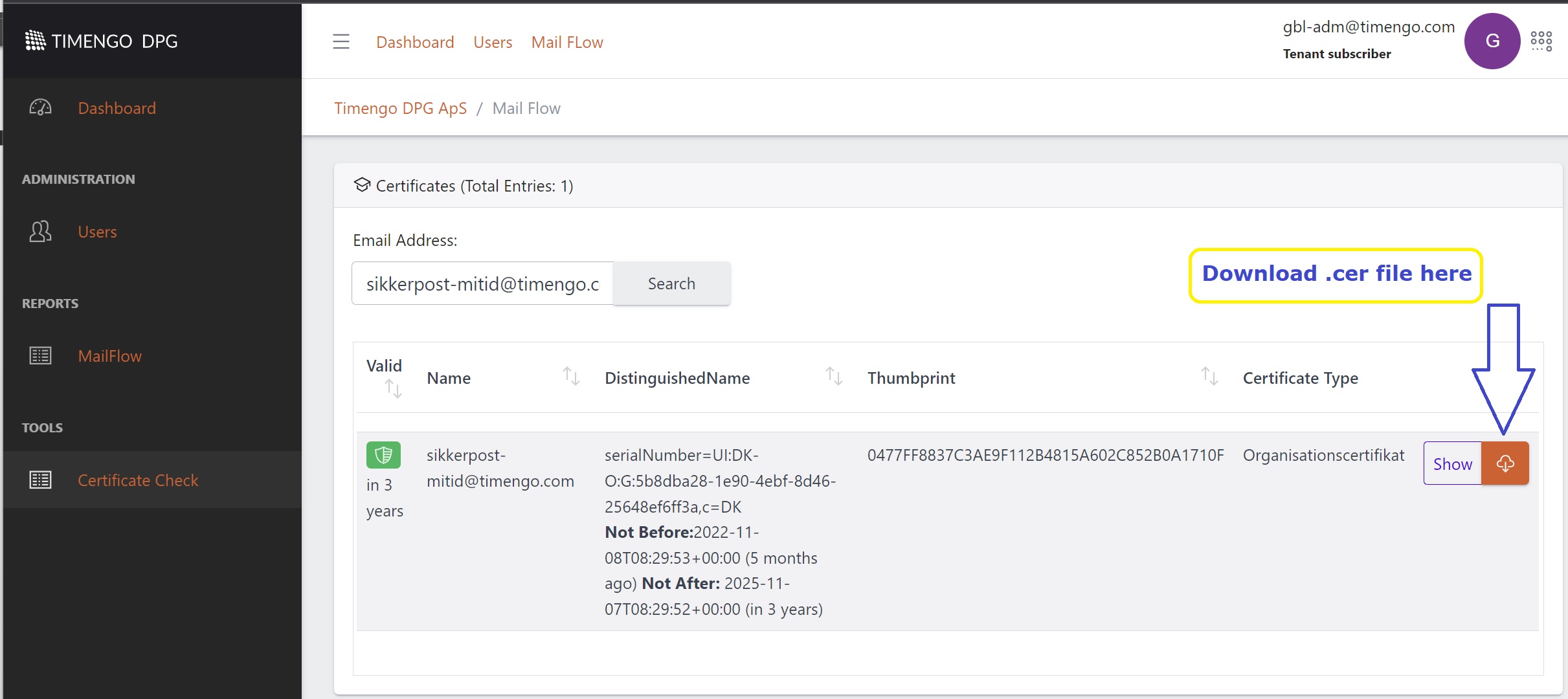.cerversion of an organization certificate (organisationscertifikat). Go to Certificate Check, look up the certificate, and select the button to download:Once completed, you will see that the certificate is installed: