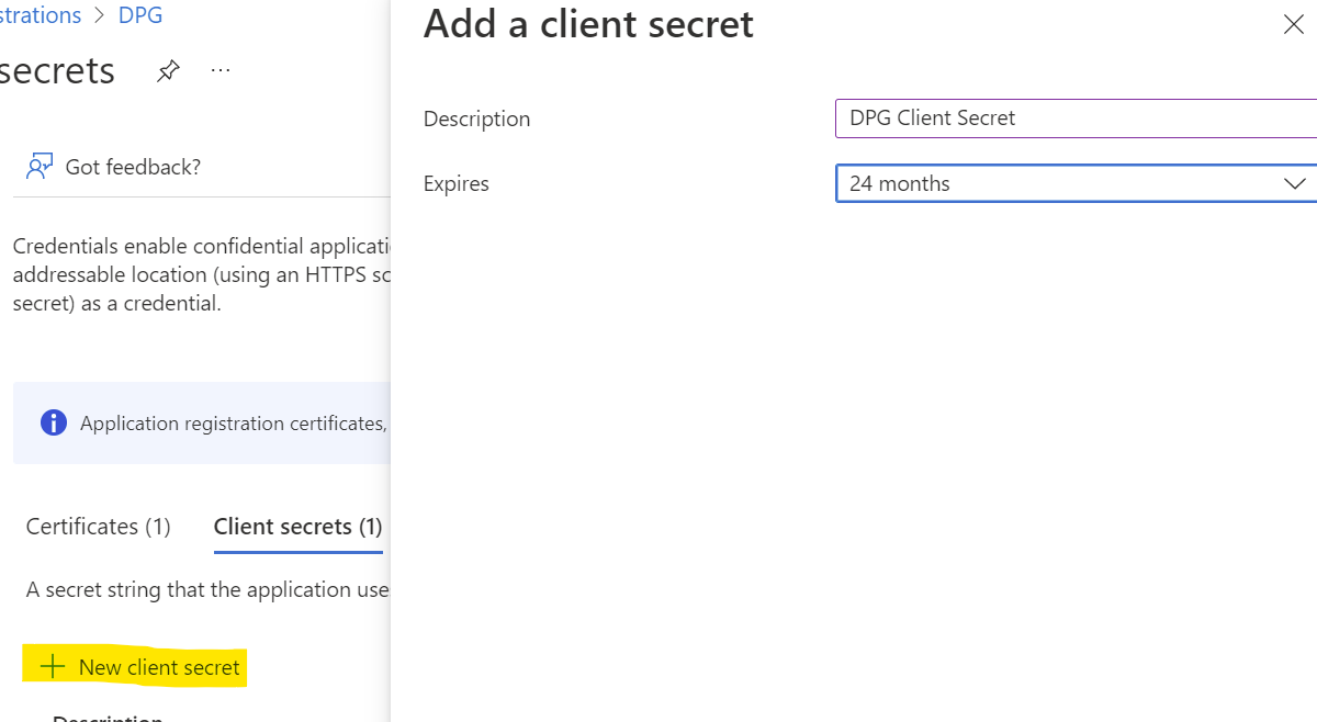Select New client secret, name it "DPG client secret", set to for instance 24 months, and select Add:
