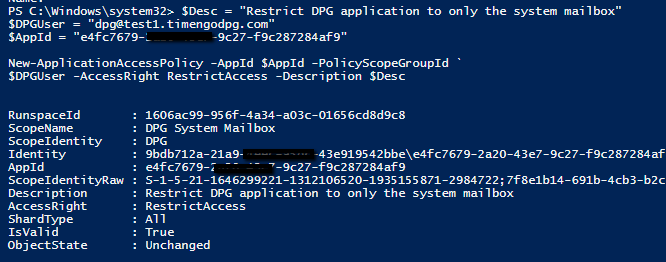 $Desc = "Restrict DPG application to only the system mailbox" $DPGSystemMailbox = "EMAIL_ADRESS_OF_THE_SYSTEM_MAILBOX" $AppId = "APPLICATION_CLIENT_ID" New-ApplicationAccessPolicy -AppId $AppId -PolicyScopeGroupId ` $DPGSystemMailbox -AccessRight RestrictAccess -Description $Desc -