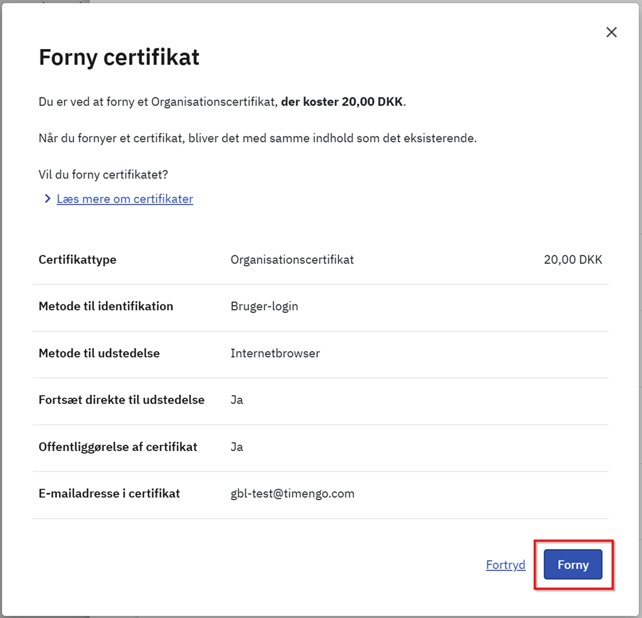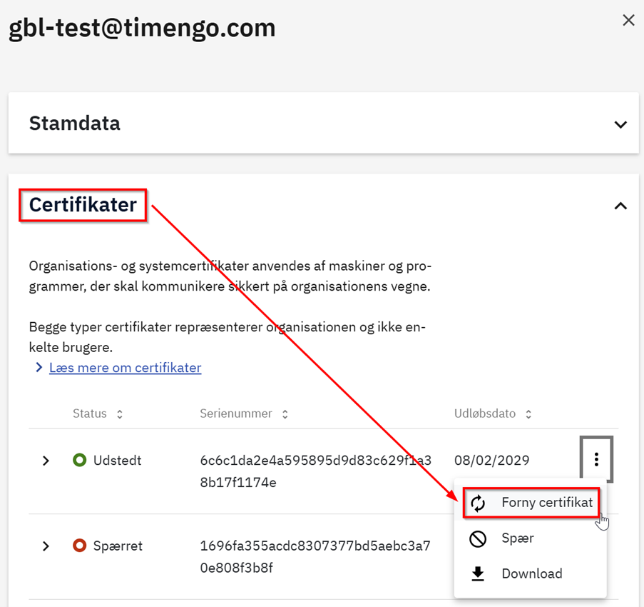 Minimér sektionen Stamdata, udvid sektionen Certifikater, og vælg Forny certifikat.