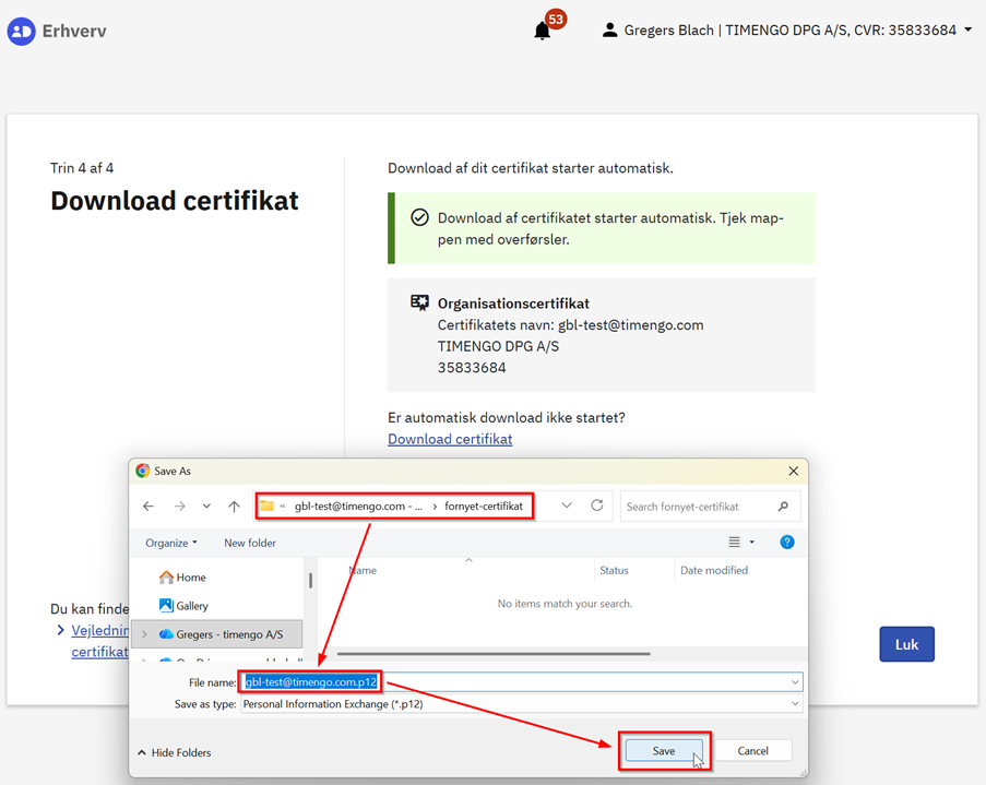 Det er MEGET VIGTIGT, at du også gemmer certifikatets .p12-fil et sikkert sted, da certifikatfilen ikke kan genskabes. Når du har valgt et sted at gemme certifikatfilen, kan du eventuelt vælge at ændre filnavnet.