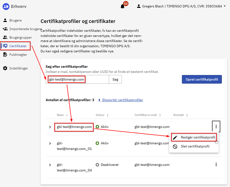 Vælg Certifikater, fremsøg den ønskede certifikatprofil, og vælg derefter Rediger certifikatprofil.