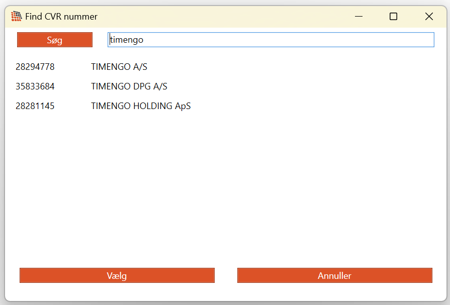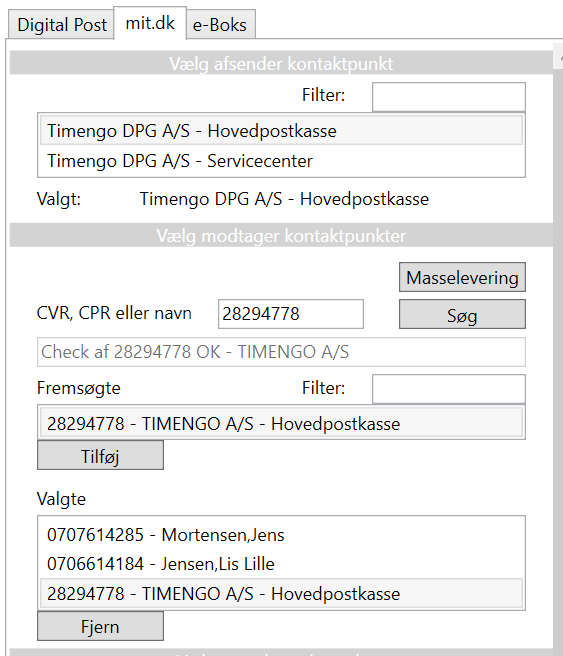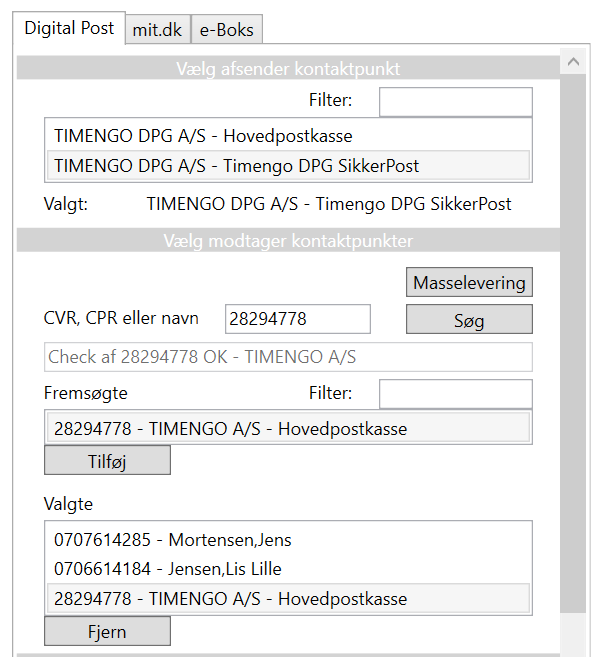 Der er mulighed for integration til CVR, så der kan søges på virksomheds- eller myndighedsnavn direkte i AddIn ved afsendelse af mit.dk-beskeder. Søgning i CVR returnerer aktive CVR-numre: