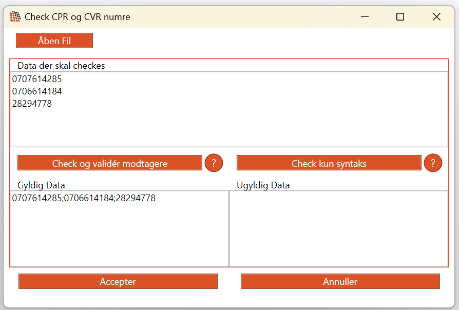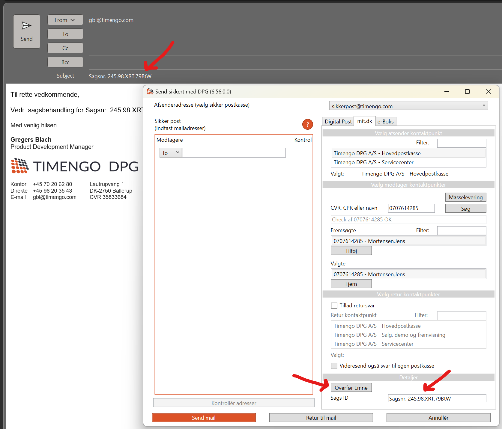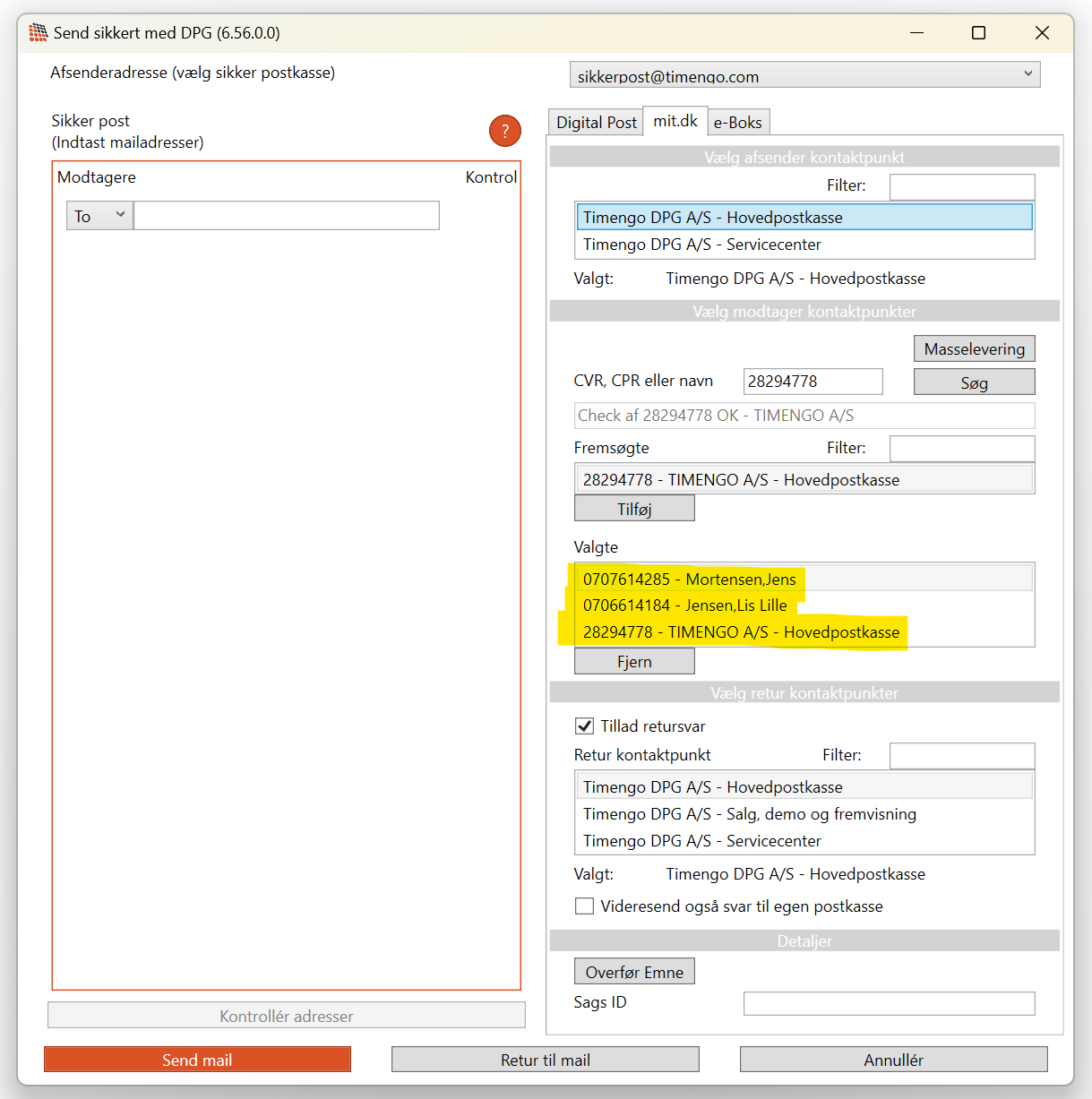 Hvis der er opsat integration til CPR/datafordeler.dk og CVR, vises personnavn og organisationsnavn direkte i AddIn, når data valideres inden afsendelse af beskeden.