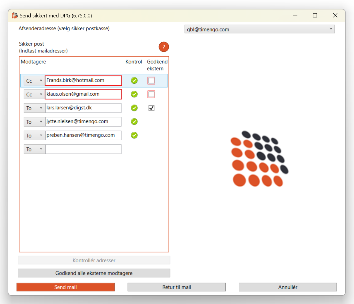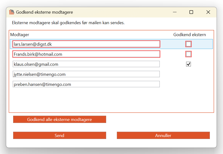 Derudover skal alle eksterne modtagere godkendes, før afsendelse er muligt.