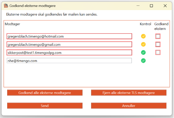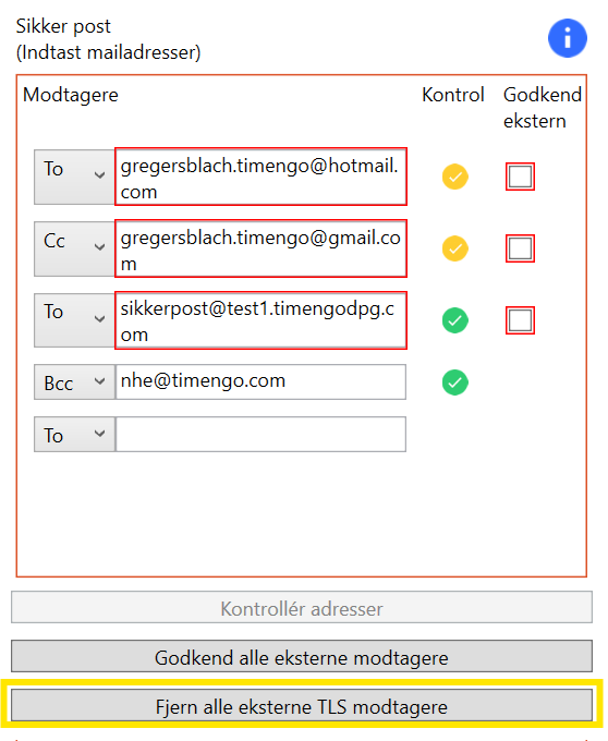 Med Mail Guard kan eksterne TLS-modtageradresser markeres med gult fluebensikon, og med knappen Fjern alle eksterne TLS modtagere er det let at fjerne alle eksterne TLS-modtagere med ét klik. S/MIME, tunnelmail og OME-modtageradresser markeres fortsat med grønt fluebensikon:
