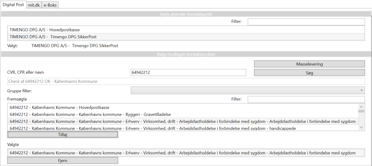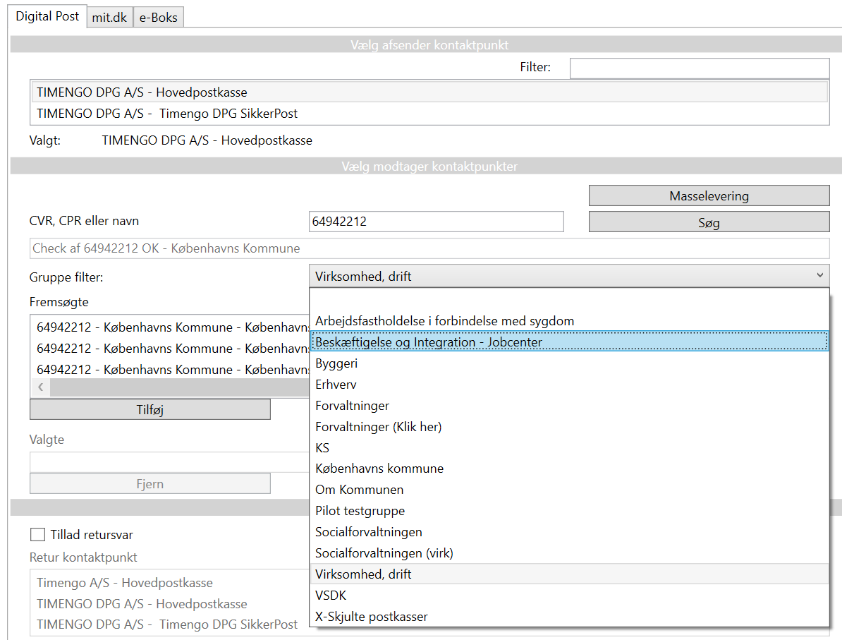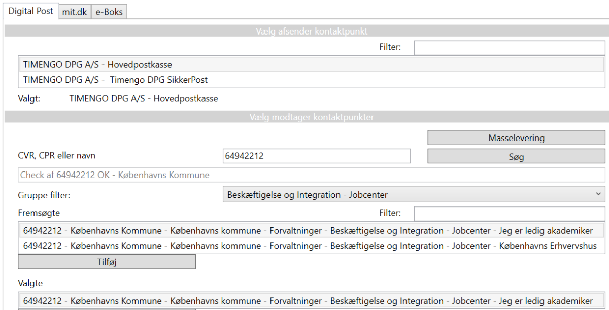Har en modtagers kontaktstruktur mange niveauer, kan gruppe-filteret bruges til at præcisere listen af fremsøgte kontaktpunkter. Vælg først gruppe:
