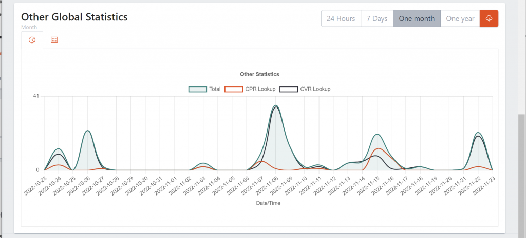 Hvis din DPG-løsning har CPR- og/eller CVR-tilslutning til navneopslag, vil der i Dashboardet vises en sammentælling af antal opslag samt en mere detaljeret grafisk statistikoversigt: