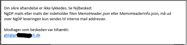 ikke kan sendes som mail til eksterne maildomæner. DPG Servicen vil afvise mailafsendelse og sende følgende besked retur til afsender:
