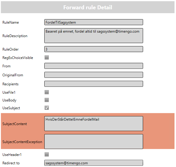 Nedenfor er et eksempel på en regel, som reagerer på en fast streng i emnefeltet og fordeler mailen til en sagssystem-postkasse: