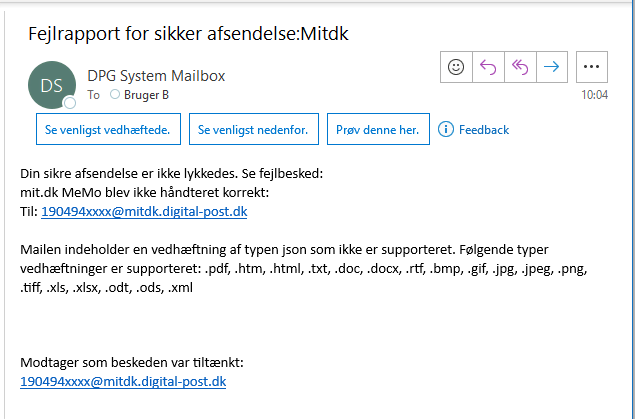 Hvis nogle af vedhæftningerne ikke er understøttede filtyper i mit.dk, modtager afsenderen følgende besked tilbage fra DPG servicen, da mit.dk vil afvise beskeden: