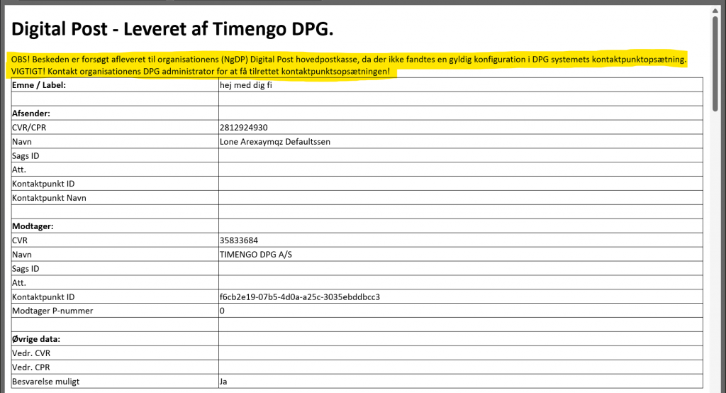 Hvis der er en manglende konfiguration, og der dermed ikke er tilknyttet en sikker postkasse/funktionspostkasse til et kontaktpunkt, så vil DPG indsætte følgende information i toppen af beskeden: