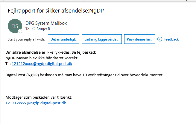Hvis der forsøges sendt flere end 10 vedhæftninger, modtager afsenderen følgende besked tilbage fra DPG servicen, da Digital Post vil afvise beskeden: