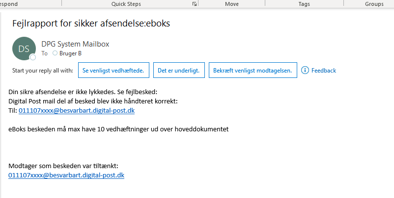 Hvis der forsøges sendt flere end 10 vedhæftninger, modtager afsenderen følgende besked tilbage fra DPG servicen, da e-Boks vil afvise beskeden: