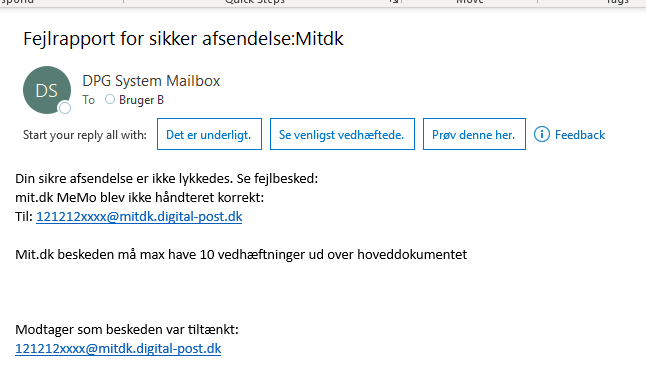 Hvis der forsøges sendt flere end 10 vedhæftninger, modtager afsenderen følgende besked tilbage fra DPG servicen, da mit.dk vil afvise beskeden: