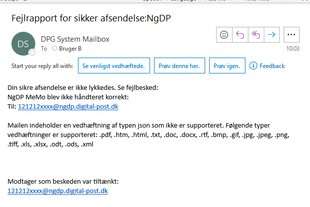 Hvis nogle af vedhæftningerne ikke er understøttede filtyper i Digital Post (NgDP), modtager afsenderen følgende besked tilbage fra DPG servicen, da Digital Post vil afvise beskeden:
