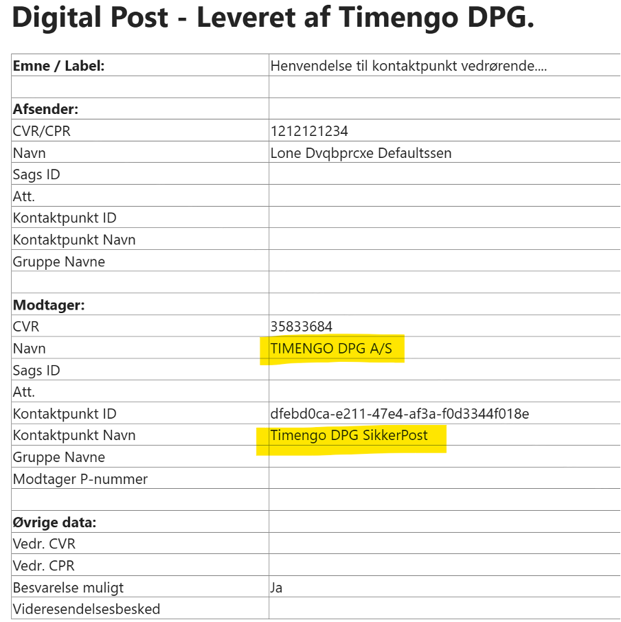 Hvis afsenderen af Digital Post og mit.dk beskeder ikke udfylder modtagers kontaktpunkt- og/eller organisationsnavn, indsætter DPG selv disse informationer i tabeloversigten. Eksempel: