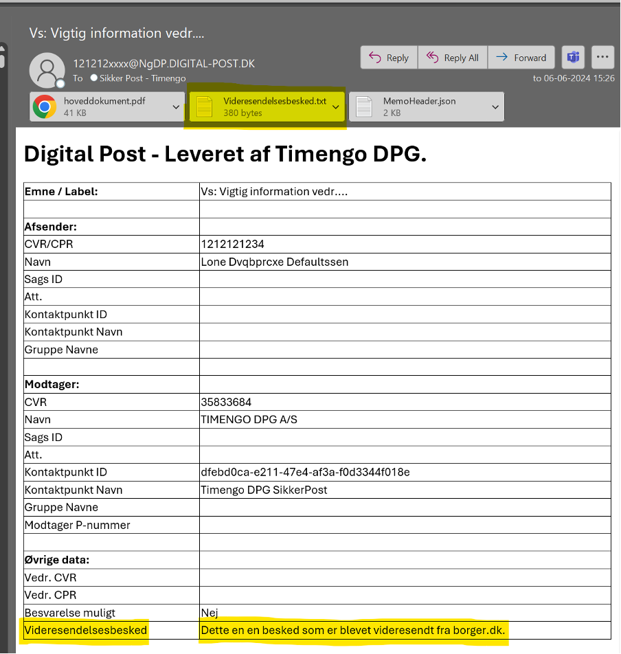 Hvis en besked videresendes som Digital Post fra enten borger.dk eller mit.dk, indsættes videresendelsesbeskeden i tabeloversigten samt i den vedhæftede fil navngivet Videresendelsesbesked.txt
