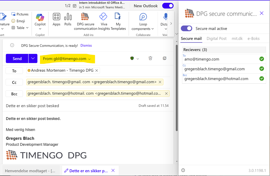 - Version 3: Her kan du frit vælge, om du vil bruge Send-knappen i mailen eller Send sikker post-besked i DPG Addin. I begge tilfælde afsendes mailen sikkert.