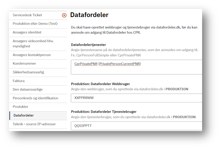 When the approval from CPR is received, datafordeler.dk support must be contacted directly, and access for Web User and Service User to the Production environment (https://selfservice.datafordeler.dk) must be requested, referring to the approval from CPR.dk, as well as IP whitelisting of the DPG service's fixed external IP address.