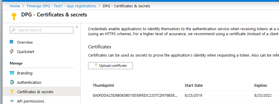 Now select Certificates & secrets. You have two options to prove the application's identity. DPG supports both: