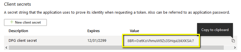 Select New client secret, name it "DPG client secret", set to for instance 24 months, and select Add: