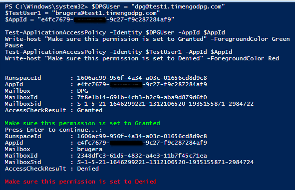 $DPGSystemMailbox = "EMAIL_ADRESS_OF_THE_SYSTEM_MAILBOX" $TestUser = "EMAIL_ADDRESS_OF_A_RANDOM_MAILBOX" $AppId = "APPLICATION_CLIENT_ID" Test-ApplicationAccessPolicy -Identity $DPGSystemMailbox -AppId $AppId Write-host "Make sure this permission is set to Granted" ` -ForegroundColor Green Pause Test-ApplicationAccessPolicy -Identity $TestUser -AppId $AppId Write-host "Make sure this permission is set to Denied" ` -ForegroundColor Red