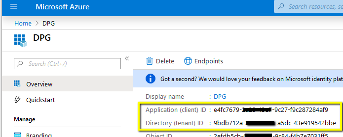 For the App registration you just created, make a note of the Application (client) ID and the Directory (tenant) ID. Both can be found in the Overview section: