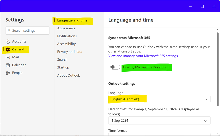 Sproget bestemmes i din profils Outlook-indstillinger (markeret med gult i skærmbilledet nedenfor), men kan også synkroniseres fra din profils Microsoft 365-indstillinger (markeret med grønt):