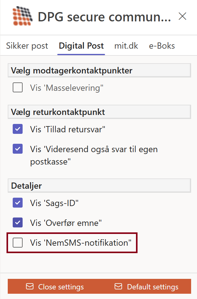 Select Close settings. The next time you send Digital Post, the NemSMS notification field will not be displayed.